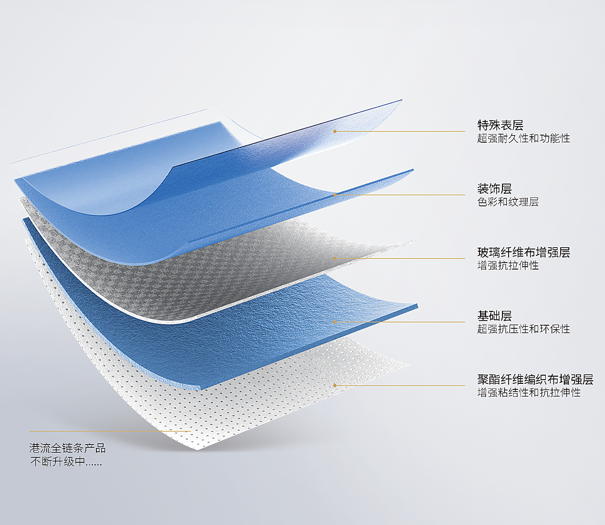 港流ERP雙纖維高耐環氧卷材地板——耐沖擊、耐磨性、耐重載、抗劃痕性、抗拉伸性強,硬度達5H-6H,使用壽命大幅延長。