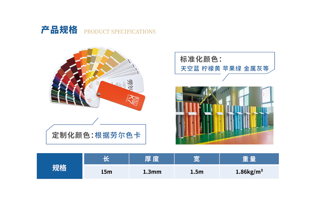 可根據勞爾色卡的顏色標卡進行色彩定制,經機械設備預制成型、保證色彩均一恒久,提升工廠環境美觀度。鋪裝后地面防水防塵、耐油污,易清潔。